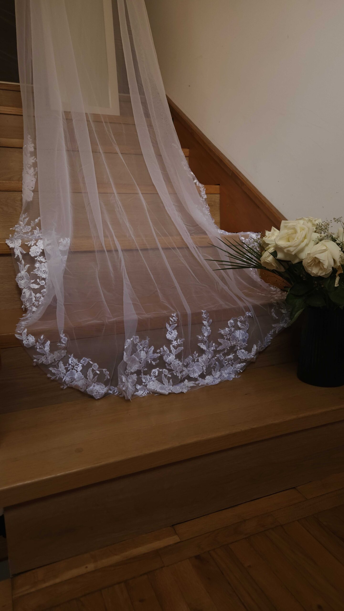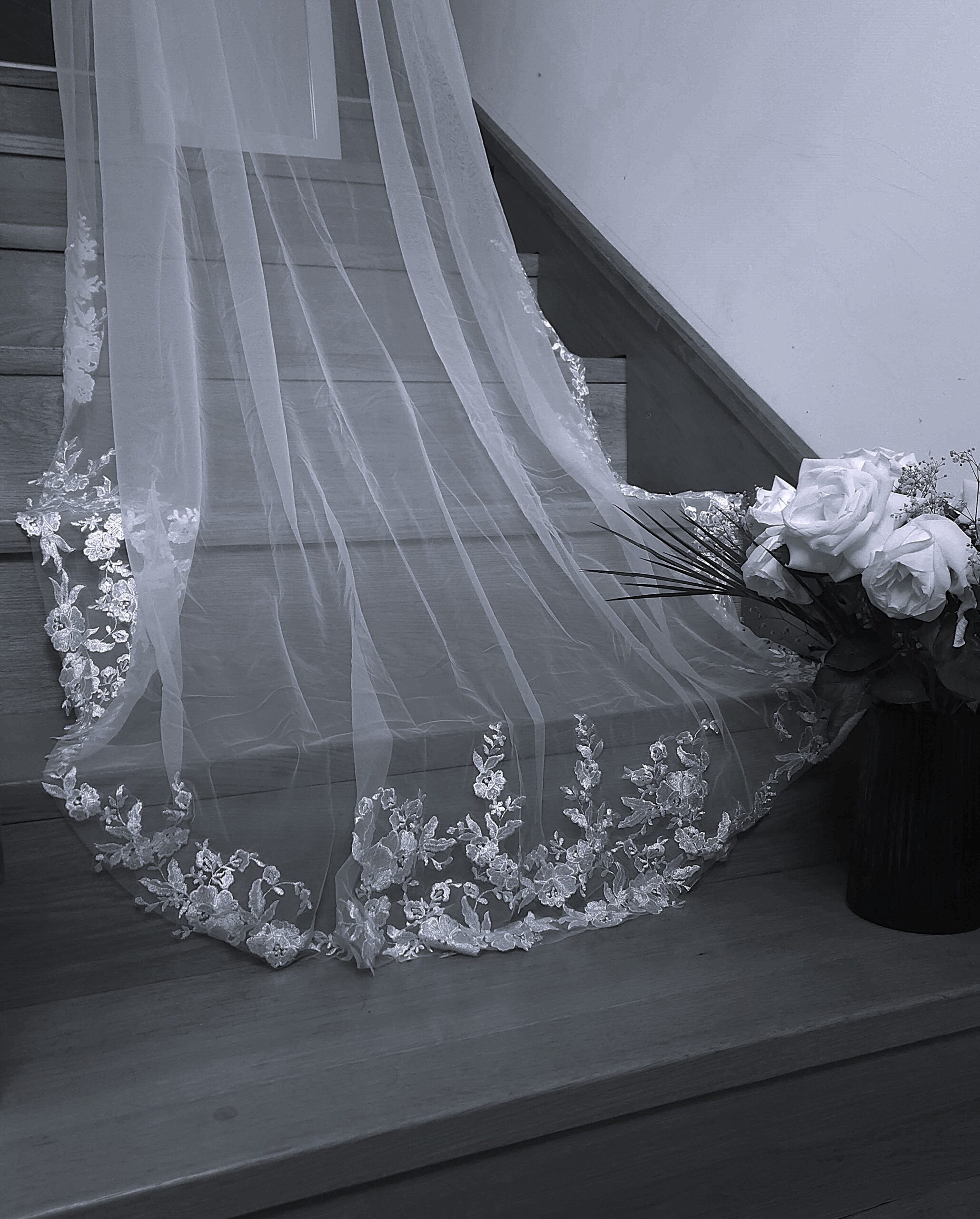 Dodajte pridih elegance in brezčasne lepote svoji poročni obleki s čudovito belo tančico. Izdelana iz nežnega, lahkotnega tila, se nežno prilega vaši pričeski in ustvari sanjski, eteričen videz.