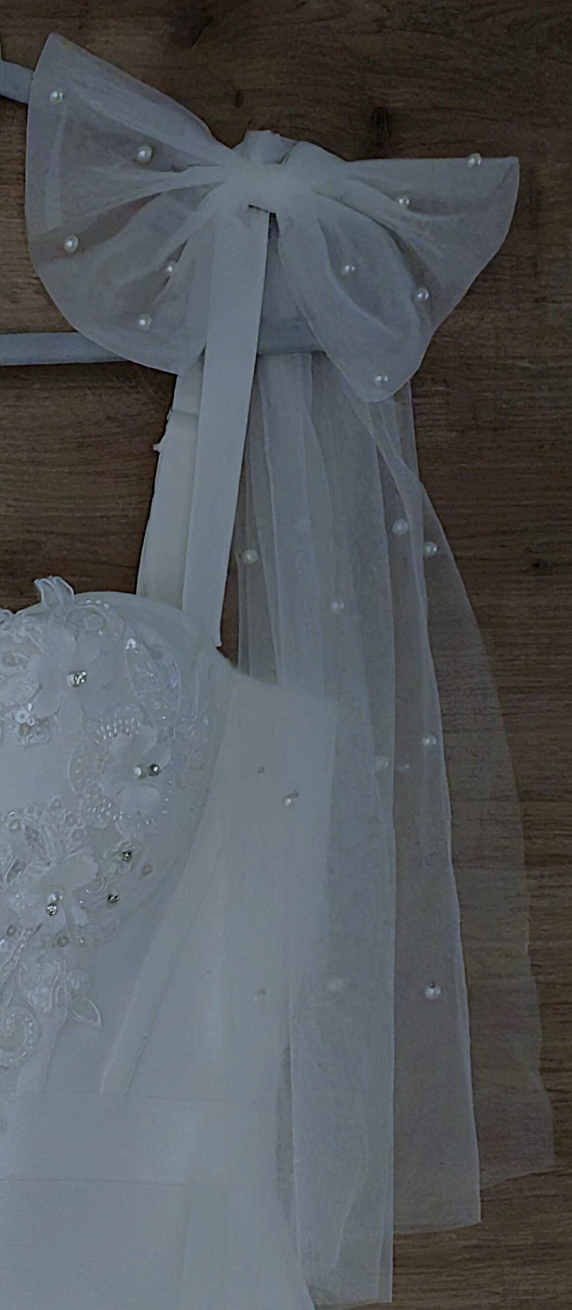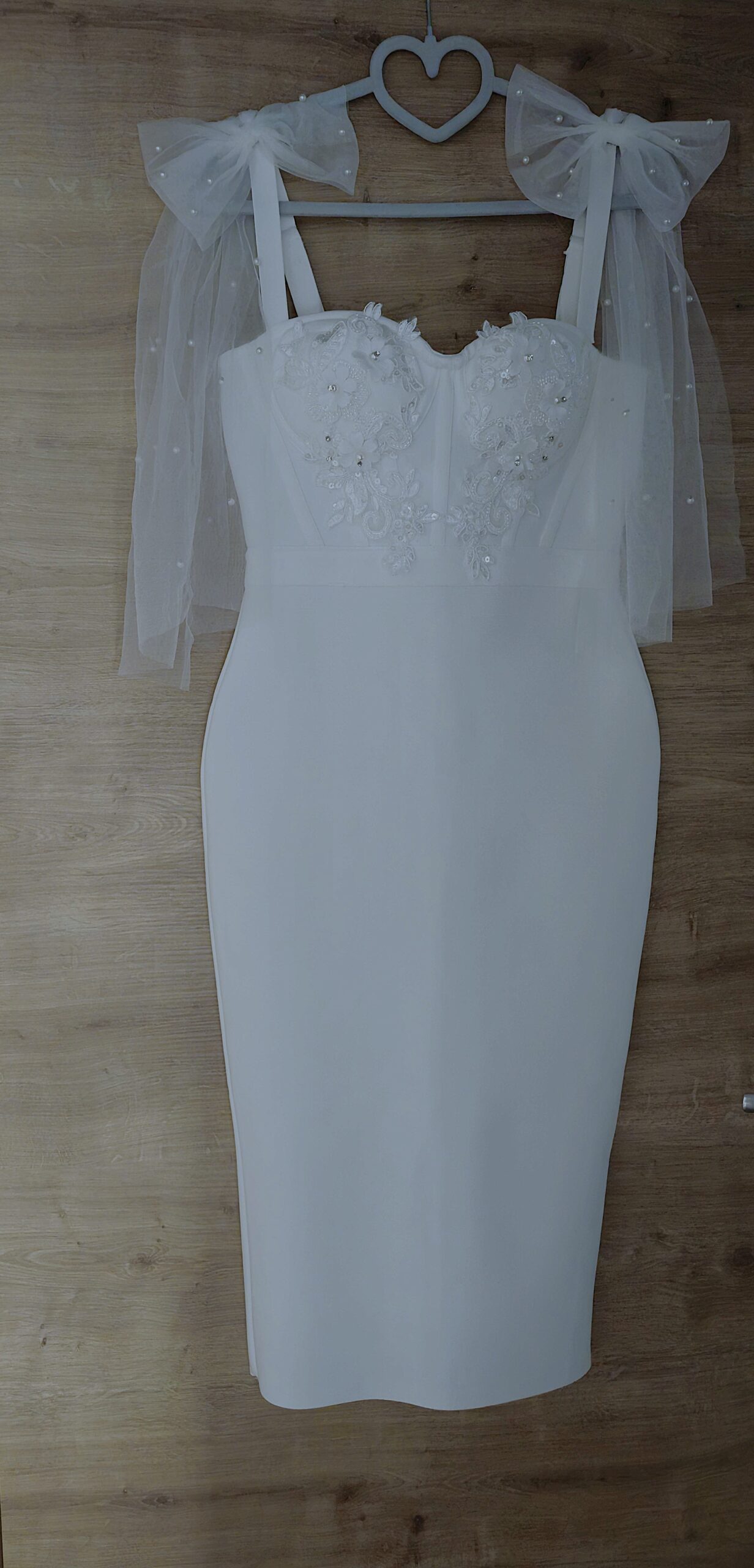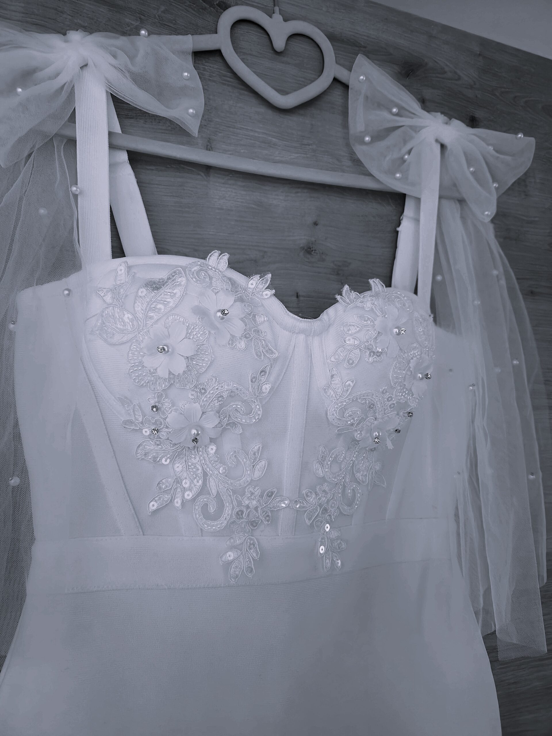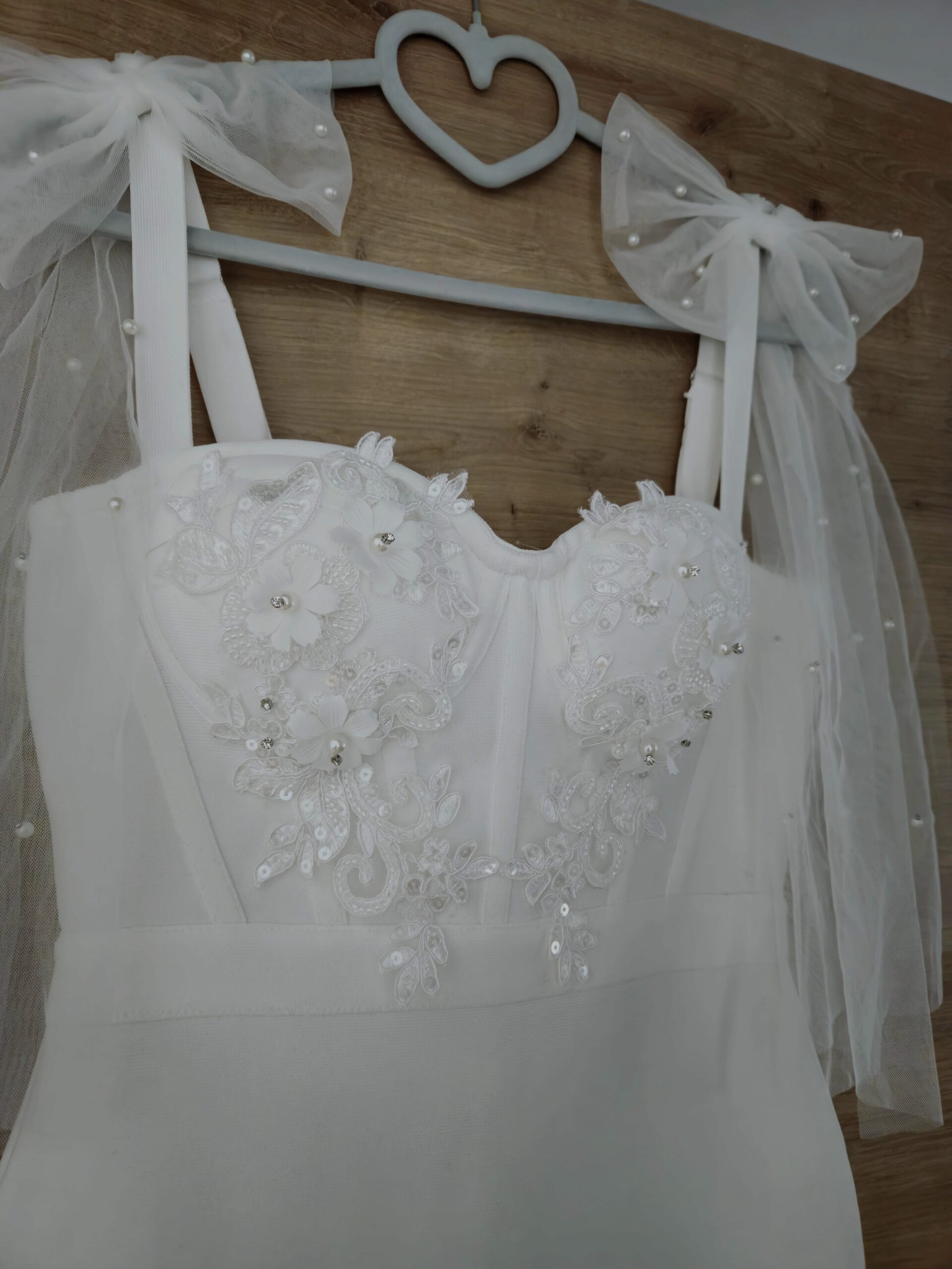 Ta prefinjena bela poročna obleka združuje eleganco in ženstvenost. Oprijet kroj poudari postavo, čudovit korzet s skrbno izbranimi in pritrjenimi čipkastimi detajli in perlicami pa doda pridih razkošja. Romantične naramnice z nežnimi pentljami poskrbijo za pravljični videz. Idealna izbira za sodobno nevesto, ki želi izgledati očarljivo in nepozabno na svoj poročni dan.